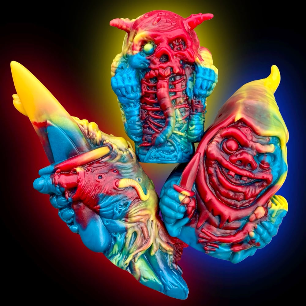 Blue, red, and yellow marbled soft vinyl.